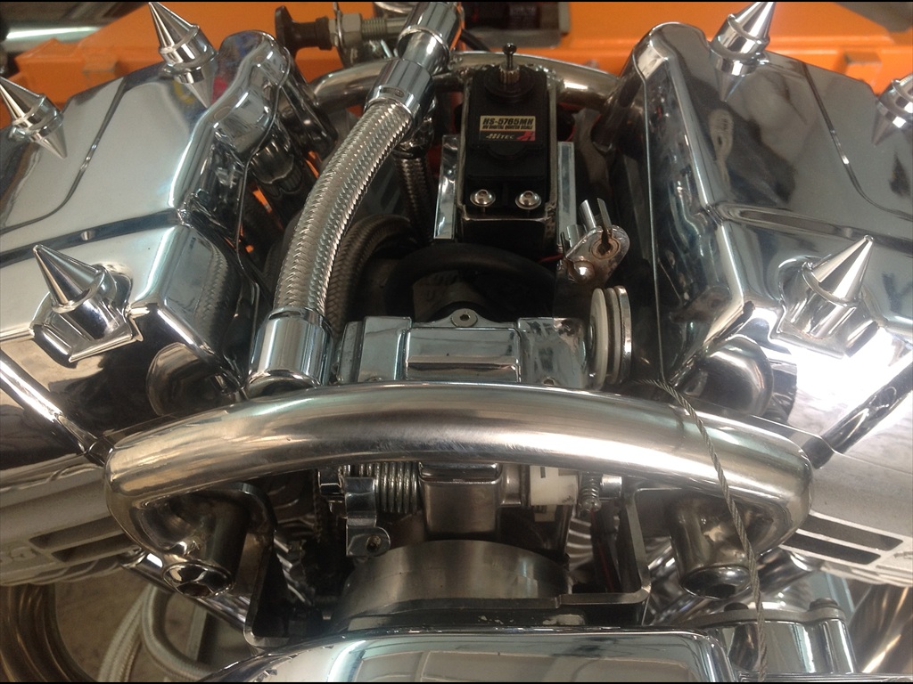 Mikes supercleaner, mega-geiler Gasgriff. Achtet mal auf das Geräusch vom Servo. Da läuft nichts nach, die Stellgeschwindigkeit ist absolut ausreichend. Der Servo braucht 0,13 Sekunden für eine 60° Drehung. Im Spiegel kann man den Servo hinten erkennen. |