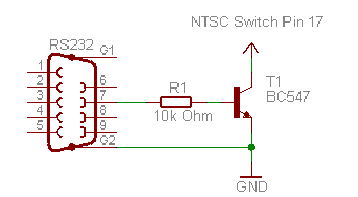 Connect the 2 wires (Ground and Pin 7 of the DB9 connector) You're done !! The NTSC Switch signal is the yellow wire in this case. |